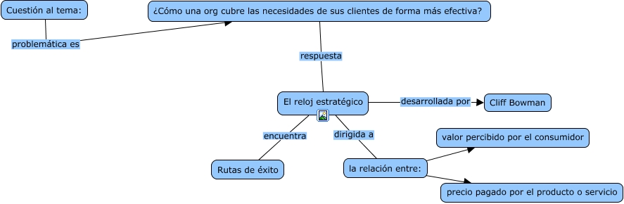 This Concept Map, created with IHMC CmapTools, has information related to: reloj estrategico, la relación entre: ???? precio pagado por el producto o servicio, El reloj estratégico dirigida a la relación entre:, Cuestión al tema: problemática es ¿Cómo una org cubre las necesidades de sus clientes de forma más efectiva?, El reloj estratégico desarrollada por Cliff Bowman, ¿Cómo una org cubre las necesidades de sus clientes de forma más efectiva? respuesta El reloj estratégico, la relación entre: ???? valor percibido por el consumidor, El reloj estratégico encuentra Rutas de éxito