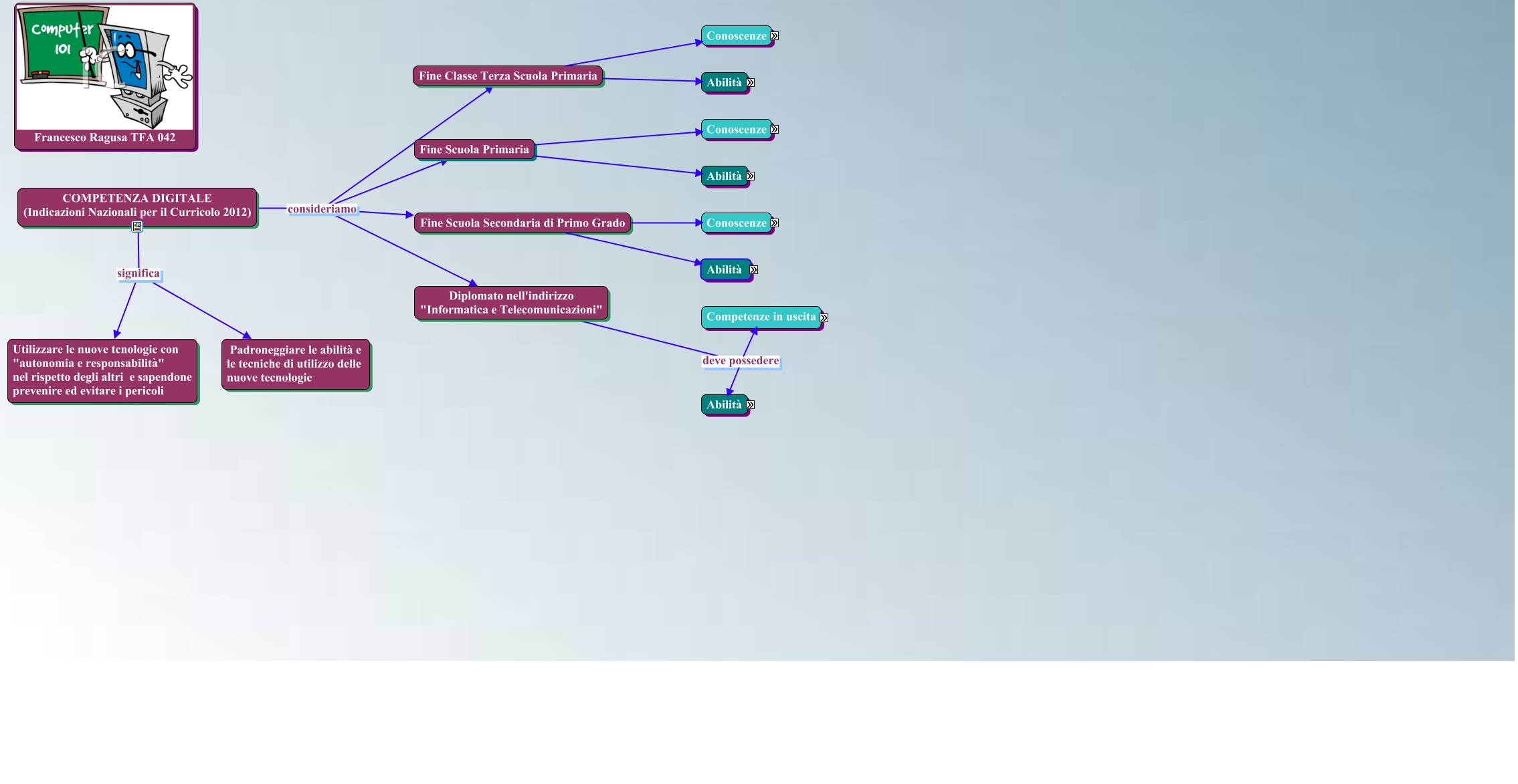 Questa Cmap, creata con IHMC CmapTools, contiene informazioni relative a: LABORATORIO DI DIDATTICA-FRANCESCO RAGUSA, Conoscenze Semplici applicazioni tecnologiche quotidiane e relative modalità di funzionamento, COMPETENZA DIGITALE (Indicazioni Nazionali per il Curricolo 2012) consideriamo Fine Scuola Primaria, Competenze in uscita Gestire progetti secondo le procedure e gli standard previsti dai sistemi aziendali di gestione della qualità e della sicurezza., Conoscenze Procedure di utilizzo di reti informatiche per ottenere dati, fare ricerche, comunicare, Abilità Utilizzare il PC, periferiche e programmi applicativi, COMPETENZA DIGITALE (Indicazioni Nazionali per il Curricolo 2012) consideriamo Fine Scuola Secondaria di Primo Grado, Conoscenze Semplici procedure di utilizzo di Internet per ottenere dati, fare ricerche, comunicare, Fine Scuola Secondaria di Primo Grado Abilità, Competenze in uscita Configurare, installare e gestire sistemi di elaborazione dati e reti., Abilità Utilizzare nelle funzioni principali televisore, video, telefono e telefonino, Conoscenze Rischi fisici nell’utilizzo di apparecchi elettrici ed elettronici, COMPETENZA DIGITALE (Indicazioni Nazionali per il Curricolo 2012) consideriamo Fine Classe Terza Scuola Primaria, Abilità Collegare le modalità di funzionamento dei dispositivi elettronici con le conoscenze scientifiche e tecniche acquisite., Conoscenze Rischi fisici nell’utilizzo di apparecchi elettrici ed elettronici, Abilità Utilizzare il PC, con la supervisione dell’insegnante, per scrivere compilare tabelle;, Abilità Individuare alcuni rischi fisici nell’uso di apparecchiature elettriche ed elettroniche e ipotizzare soluzioni preventive, Abilità Utilizzare materiali digitali per l’apprendimento, Abilità Utilizzare strumenti informatici e di comunicazione per elaborare dati, testi e immagini e produrre documenti in diverse situazioni., Competenze in uscita Scegliere dispositivi e strumenti in base alle loro caratteristiche funzionali, COMPETENZA DIGITALE (Indicazioni Nazionali per il Curricolo 2012) consideriamo Diplomato nell'indirizzo "Informatica e Telecomunicazioni"