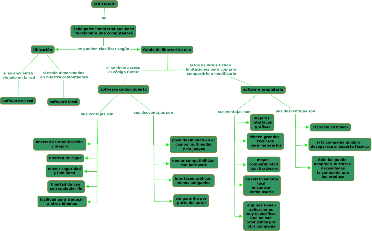 This Concept Map, created with IHMC CmapTools, has information related to: software, Ubicación si se encuentra alojado en la red software en red, software propietario sus ventajas son es relativamente fácil encontrar como usarlo, software propietario sus ventajas son tienen grandes recursos para mejorarlos, Toda parte inmaterial que hace funcionar a una computadora se pueden clasificar según Ubicación, software código abierto sus desventajas son poca flexibilidad en el campo multimedia y de juegos, Grado de libertad de uso si los usuarios tienen limitaciones para copiarlo compartirlo o modificarlo software propietario, software propietario sus desventajas son si la compañía quiebra, desaparece el soporte técnico, software código abierto sus desventajas son interfaces gráficas menos amigables, Grado de libertad de uso si se tiene acceso al código fuente software código abierto, SOFTWARE es Toda parte inmaterial que hace funcionar a una computadora, software código abierto sus ventajas son mayor seguridad y fiabilidad, software propietario sus desventajas son Solo los puede adaptar a nuestras necesidades la compañía que los produce, software propietario sus ventajas son mayor compatibilidad con hardware, software propietario sus desventajas son El precio es mayor, software código abierto sus ventajas son facilidad para traducir a otros idiomas, software código abierto sus ventajas son libertad de modificación y mejora, software código abierto sus desventajas son sin garantía por parte del autor, Toda parte inmaterial que hace funcionar a una computadora se pueden clasificar según Grado de libertad de uso, software propietario sus ventajas son mejores interfaces gráficas, software código abierto sus ventajas son libertad de uso con cualquier fin