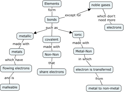 This Concept Map, created with IHMC CmapTools, has information related to: Elements, noble gases which don't need more electrons, bonds except for noble gases, covalent made with Non-Non, Non-Non that share electrons, bonds such as covalent, bonds such as metallic, metallic made with metals, flowing electrons and is malleable, Metal-Non in which electron is transferred, metals which have flowing electrons, bonds such as ionic, ionic made with Metal-Non, electron is transferred from metal to non-metal, Elements form bonds