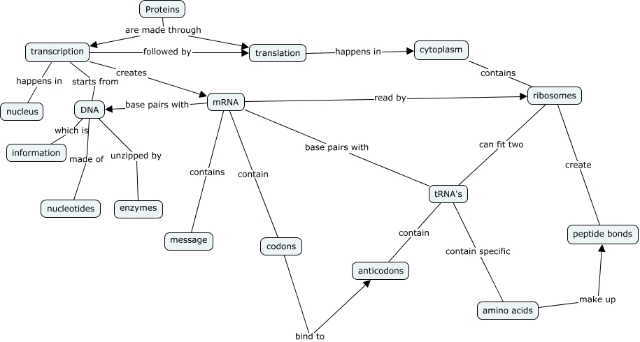This Concept Map, created with IHMC CmapTools, has information related to: Protein Synthesis, transcription creates mRNA, Proteins are made through transcription, transcription starts from DNA, tRNA's contain anticodons, mRNA read by ribosomes, transcription happens in nucleus, DNA made of nucleotides, mRNA contain codons, mRNA base pairs with DNA, amino acids make up peptide bonds, Proteins are made through translation, DNA which is information, mRNA contains message, ribosomes create peptide bonds, ribosomes can fit two tRNA's, translation happens in cytoplasm, DNA unzipped by enzymes, transcription followed by translation, cytoplasm contains ribosomes, codons bind to anticodons