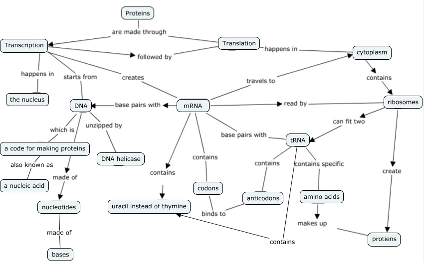 This Concept Map, created with IHMC CmapTools, has information related to: Protein Synthesis, tRNA contains uracil instead of thymine, a code for making proteins also known as a nucleic acid, nucleotides made of bases