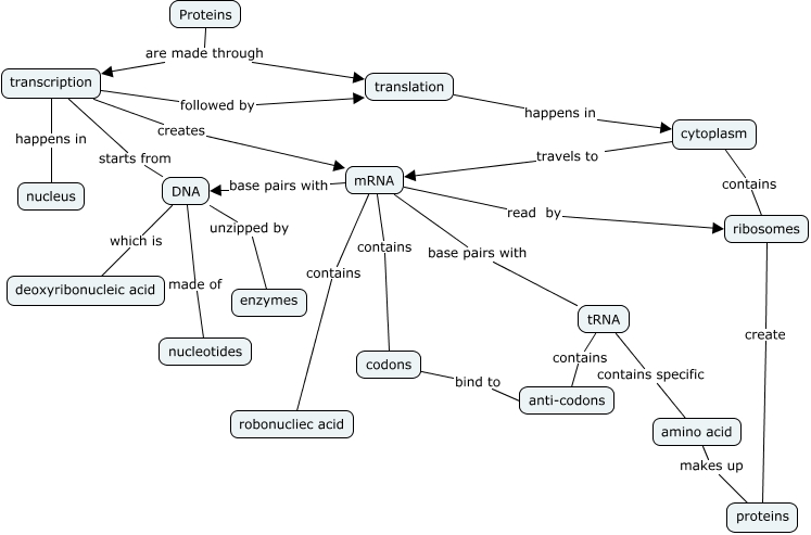 This Concept Map, created with IHMC CmapTools, has information related to: Protein Synthesis, Proteins are made through translation, transcription creates mRNA, transcription followed by translation, codons bind to anti-codons, transcription starts from DNA, tRNA contains specific amino acid, mRNA base pairs with DNA, mRNA read by ribosomes, DNA unzipped by enzymes, cytoplasm travels to mRNA, DNA made of nucleotides, Proteins are made through transcription, mRNA contains robonucliec acid, amino acid makes up proteins, cytoplasm contains ribosomes, ribosomes create proteins, tRNA contains anti-codons, mRNA base pairs with tRNA, transcription happens in nucleus, translation happens in cytoplasm