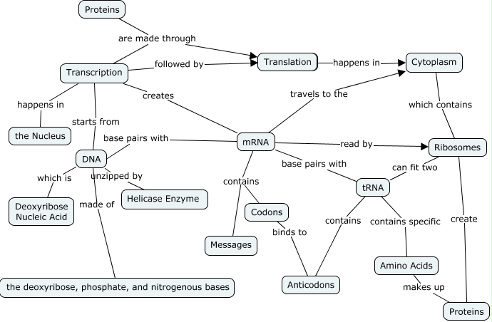 This Concept Map, created with IHMC CmapTools, has information related to: Protein Synthesis, Transcription starts from DNA, DNA made of the deoxyribose, phosphate, and nitrogenous bases, mRNA contains Codons, DNA unzipped by Helicase Enzyme, Cytoplasm which contains Ribosomes, DNA which is Deoxyribose Nucleic Acid, Translation happens in Cytoplasm, mRNA travels to the Cytoplasm, Proteins are made through Translation, tRNA contains Anticodons, mRNA read by Ribosomes, Ribosomes can fit two tRNA, mRNA base pairs with DNA, mRNA contains Messages, Transcription followed by Translation, tRNA contains specific Amino Acids, mRNA base pairs with tRNA, Transcription creates mRNA, Ribosomes create Proteins, Amino Acids makes up Proteins