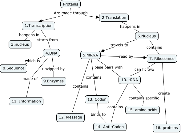 This Concept Map, created with IHMC CmapTools, has information related to: Protein Synthesis, 5.mRNA contains 13. Codon, 5.mRNA contains 12. Message, 2.Translation happens in 6.Nucleus, 4.DNA which is 8.Sequence, 10. tRNA contains specific 15. amino acids, 1.Transcription starts from 4.DNA, 4.DNA made of 11. Information, 10. tRNA contains 14. Anti-Codon, 4.DNA unzipped by 9.Enzymes, 6.Nucleus travels to 5.mRNA, 7. Ribosomes create 16. proteins, Proteins Are made through 1.Transcription, Proteins Are made through 2.Translation, 13. Codon binds to 14. Anti-Codon, 6.Nucleus contains 7. Ribosomes, 5.mRNA base pairs with 10. tRNA, 1.Transcription happens in 3.nucleus, 5.mRNA read by 7. Ribosomes, 7. Ribosomes can fit two 10. tRNA