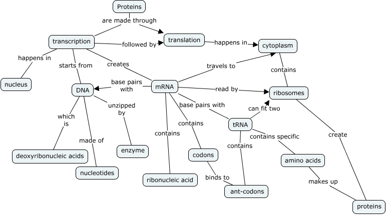 This Concept Map, created with IHMC CmapTools, has information related to: Protein Synthesis, mRNA contains codons, tRNA contains specific amino acids, mRNA base pairs with tRNA, transcription happens in nucleus, ribosomes create proteins, DNA which is deoxyribonucleic acids, transcription followed by translation, Proteins are made through transcription, mRNA read by ribosomes, translation happens in cytoplasm, mRNA travels to cytoplasm, cytoplasm contains ribosomes, amino acids makes up proteins, Proteins are made through translation, codons binds to ant-codons, DNA unzipped by enzyme, tRNA contains ant-codons, transcription creates mRNA, mRNA base pairs with DNA, DNA made of nucleotides