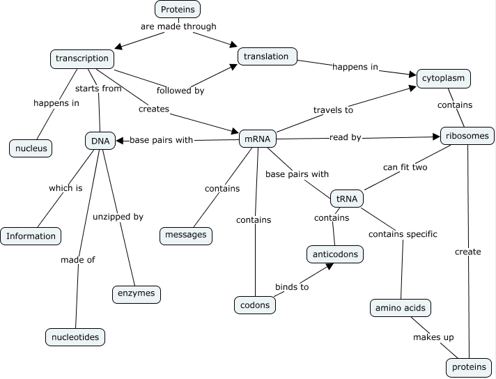 This Concept Map, created with IHMC CmapTools, has information related to: Protein Synthesis, transcription happens in nucleus, mRNA base pairs with DNA, cytoplasm contains ribosomes, transcription followed by translation, ribosomes create proteins, mRNA contains messages, Proteins are made through transcription, transcription starts from DNA, Proteins are made through translation, ribosomes can fit two tRNA, mRNA base pairs with tRNA, DNA which is Information, amino acids makes up proteins, mRNA travels to cytoplasm, DNA made of nucleotides, mRNA read by ribosomes, codons binds to anticodons, transcription creates mRNA, DNA unzipped by enzymes, tRNA contains specific amino acids