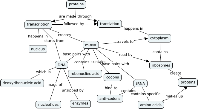 This Concept Map, created with IHMC CmapTools, has information related to: Protein Synthesis, amino acids makes up proteins, proteins are made through translation, mRNA read by ribosomes, mRNA base pairs with DNA, transcription followed by translation, codons bind to anti-codons, transcription creates mRNA, cytoplasm contains ribosomes, mRNA contains robonucliec acid, tRNA contains anti-codons, mRNA travels to cytoplasm, DNA made of nucleotides, DNA which is deoxyribonucleic acid, mRNA base pairs with tRNA, proteins are made through transcription, mRNA contains codons, translation happens in cytoplasm, DNA unzipped by enzymes, transcription starts from DNA, tRNA contains specific amino acids