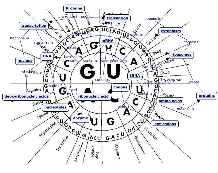This Concept Map, created with IHMC CmapTools, has information related to: Protein Synthesis, ribosomes create proteins, tRNA can fit two ribosomes, tRNA contains specific amino acids, mRNA base pairs with tRNA, mRNA contains ribonucleic acid, transcription followed by translation, mRNA travels to cytoplasm, translation happens in cytoplasm, Proteins are made through transcription, DNA unzipped by enzyme, amino acids makes up proteins, mRNA read by ribosomes, Proteins are made through translation, codons binds to ant-codons, transcription creates mRNA, DNA which is deoxyribonucleic acids, cytoplasm contains ribosomes, transcription starts from DNA, DNA made of nucleotides, transcription happens in nucleus
