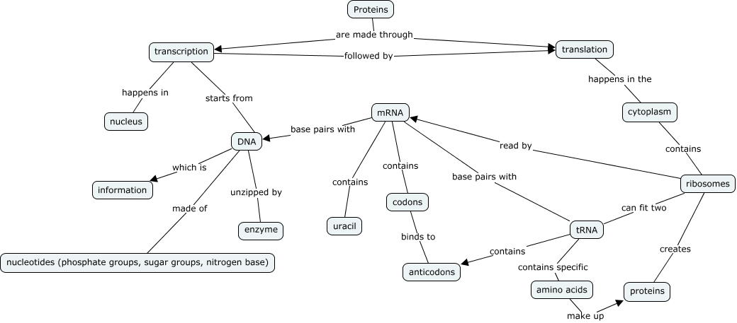 This Concept Map, created with IHMC CmapTools, has information related to: Protein Synthesis, amino acids make up proteins, DNA which is information, Proteins are made through translation, mRNA contains uracil, DNA made of nucleotides (phosphate groups, sugar groups, nitrogen base), translation happens in the cytoplasm, ribosomes creates proteins, ribosomes read by mRNA, mRNA base pairs with tRNA, tRNA contains specific amino acids, tRNA contains anticodons, transcription followed by translation, mRNA contains codons, cytoplasm contains ribosomes, DNA unzipped by enzyme, Proteins are made through transcription, codons binds to anticodons, transcription happens in nucleus, mRNA base pairs with DNA, transcription starts from DNA