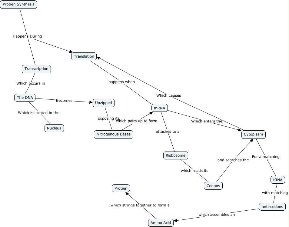 This Concept Map, created with IHMC CmapTools, has information related to: Protein Synthesis, Protien Synthesis Happens During Translation, mRNA Which enters the Cytoplasm, Risbosome which reads its Codons, Nitrogenous Bases which pairs up to form mRNA, Protien Synthesis Happens During Transcription, The DNA Becomes Unzipped, The DNA Which is located in the Nucleus, mRNA attaches to a Risbosome, Transcription Which occurs in The DNA, tRNA with matching anti-codons, Unzipped Exposing its Nitrogenous Bases, Codons and searches the Cytoplasm, Amino Acid which strings together to form a Protien, Cytoplasm For a matching tRNA, Translation happens when mRNA, anti-codons which assembles an Amino Acid, Cytoplasm Which causes Translation