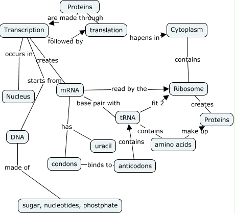This Concept Map, created with IHMC CmapTools, has information related to: Protein Synthesis, amino acids make up Proteins, DNA made of sugar, nucleotides, phostphate, mRNA read by the Ribosome, Proteins translation, Proteins are made through Transcription, Transcription starts from DNA, tRNA fit 2 Ribosome, translation hapens in Cytoplasm, Transcription occurs in Nucleus, tRNA contains amino acids, Cytoplasm contains Ribosome, Transcription followed by translation, Transcription creates mRNA, anticodons contains tRNA, mRNA has condons, condons binds to anticodons, Ribosome creates Proteins, mRNA base pair with tRNA, mRNA has uracil