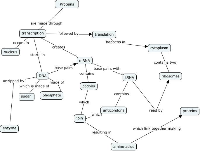 This Concept Map, created with IHMC CmapTools, has information related to: Protein Synthesis, Proteins are made through transcription, transcription occurs in nucleus, amino acids which link together making proteins, tRNA contains anticondons, DNA base pairs mRNA, transcription followed by translation, tRNA read by ribosomes, transcription starts in DNA, cytoplasm contains two ribosomes, mRNA contains codons, anticondons which join, DNA which is made of sugar, mRNA base pairs with tRNA, DNA made of phosphate, translation happens in cytoplasm, transcription creates mRNA, codons which join, DNA unzipped by enzyme, join resulting in amino acids