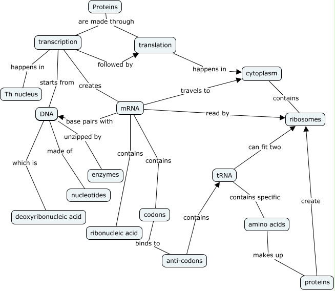 This Concept Map, created with IHMC CmapTools, has information related to: Protein synthesis, Proteins are made through translation, DNA which is deoxyribonucleic acid, codons binds to anti-codons, anti-codons contains tRNA, Proteins are made through transcription, transcription happens in Th nucleus, translation happens in cytoplasm, mRNA base pairs with ????, mRNA travels to cytoplasm, tRNA contains specific amino acids, mRNA read by ribosomes, mRNA contains ribonucleic acid, DNA made of nucleotides, proteins create ribosomes, cytoplasm contains ribosomes, mRNA contains codons, transcription starts from DNA, transcription followed by translation, tRNA can fit two ribosomes, amino acids makes up proteins