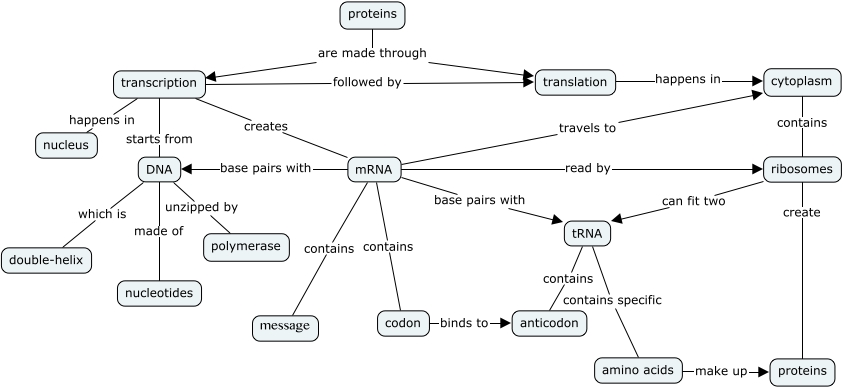 This Concept Map, created with IHMC CmapTools, has information related to: Protein Synthesis, mRNA base pairs with DNA, mRNA base pairs with tRNA, mRNA contains codon, mRNA read by ribosomes, transcription starts from DNA, tRNA contains anticodon, DNA which is double-helix, transcription followed by translation, mRNA travels to cytoplasm, ribosomes can fit two tRNA, codon binds to anticodon, transcription creates mRNA, tRNA contains specific amino acids, proteins are made through transcription, DNA unzipped by polymerase, proteins are made through translation, amino acids make up proteins, translation happens in cytoplasm, ribosomes create proteins, DNA made of nucleotides