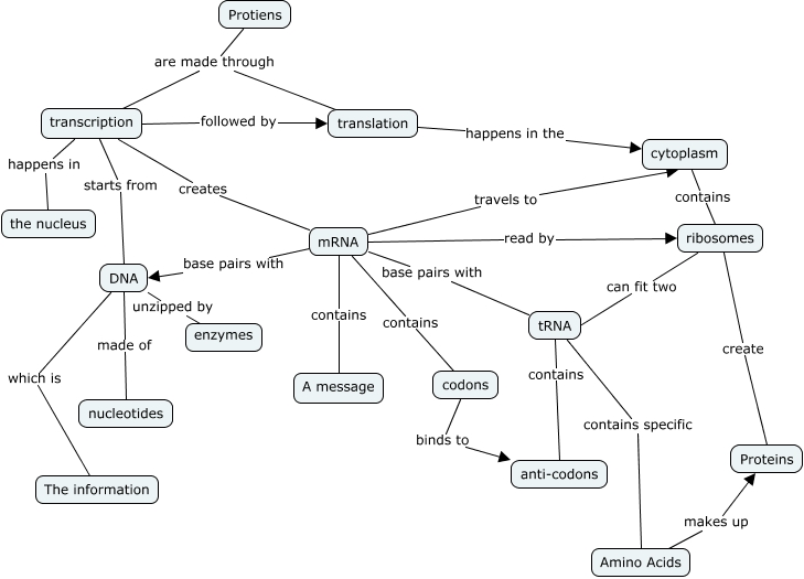 This Concept Map, created with IHMC CmapTools, has information related to: Protein Synthesis, mRNA contains codons, Protiens are made through translation, transcription creates mRNA, codons binds to anti-codons, DNA unzipped by enzymes, ribosomes can fit two tRNA, mRNA travels to cytoplasm, transcription happens in the nucleus, Amino Acids makes up Proteins, ribosomes create Proteins, DNA which is The information, tRNA contains specific Amino Acids, tRNA contains anti-codons, mRNA base pairs with tRNA, Protiens are made through transcription, translation happens in the cytoplasm, mRNA read by ribosomes, transcription starts from DNA, cytoplasm contains ribosomes, mRNA base pairs with DNA