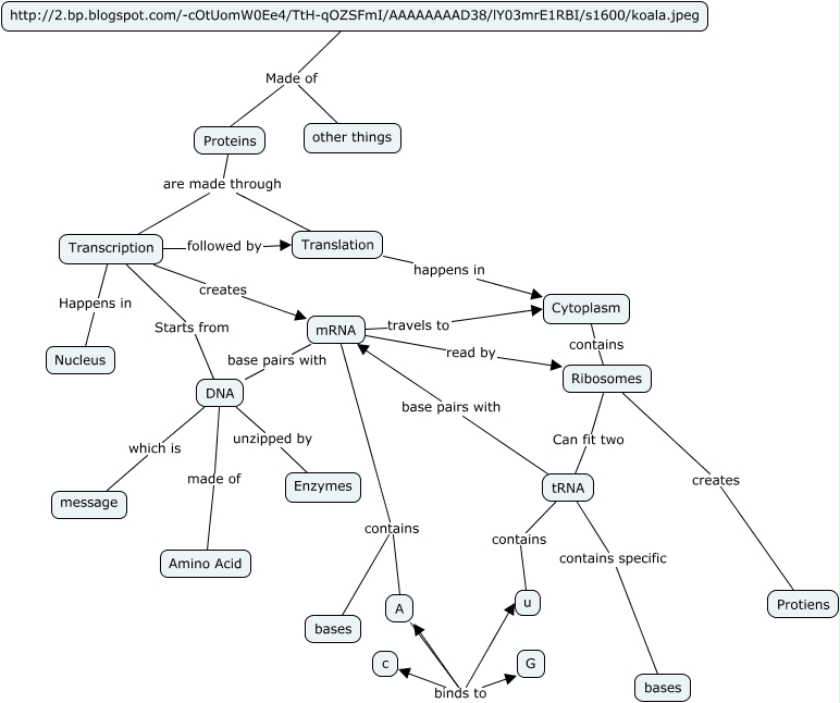 This Concept Map, created with IHMC CmapTools, has information related to: Protein Syn, mRNA base pairs with DNA, Transcription followed by Translation, Cytoplasm contains Ribosomes, Transcription Starts from DNA, Ribosomes creates Protiens, http://2.bp.blogspot.com/-cOtUomW0Ee4/TtH-qOZSFmI/AAAAAAAAD38/lY03mrE1RBI/s1600/koala.jpeg Made of other things, Transcription creates mRNA, Translation happens in Cytoplasm, tRNA contains specific bases, http://2.bp.blogspot.com/-cOtUomW0Ee4/TtH-qOZSFmI/AAAAAAAAD38/lY03mrE1RBI/s1600/koala.jpeg Made of Proteins, mRNA read by Ribosomes, A binds to c, mRNA contains bases, DNA which is message, Proteins are made through Transcription, tRNA base pairs with mRNA, A binds to G, mRNA travels to Cytoplasm, A binds to u, Proteins are made through Translation