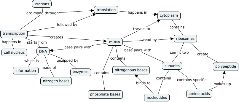 This Concept Map, created with IHMC CmapTools, has information related to: Protein Synthesis.cmap, transcription starts from DNA, mRNA contains nitrogenous bases, ribosomes can fit two subunits, cytoplasm contains ribosomes, mRNA base pairs with subunits, DNA made of nitrogen bases, DNA which is information, mRNA base pairs with DNA, subunits contains specific amino acids, translation happens in cytoplasm, mRNA contains phosphate bases, DNA unzipped by enzymes, mRNA read by ribosomes, mRNA travels to cytoplasm, ribosomes create polypeptide, amino acids makes up polypeptide, subunits contains nucleotides, Proteins are made through transcription, transcription creates mRNA, nucleotides binds to nitrogenous bases