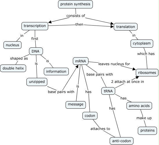 This Concept Map, created with IHMC CmapTools, has information related to: Protein Synthesis, DNA shaped as double helix, unzipped base pairs with mRNA, DNA is unzipped, tRNA has amino acids, mRNA has codon, transcription then translation, amino acids make up proteins, translation in cytoplasm, protein synthesis consists of translation, transcription in nucleus, tRNA has anti-codon, mRNA is message, mRNA base pairs with tRNA, mRNA leaves nucleus for ribosomes, cytoplasm which has ribosomes, protein synthesis consists of transcription, transcription first DNA, tRNA 2 attach at once in ribosomes, codon attaches to anti-codon, DNA is information