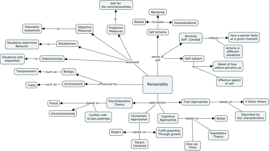 This Concept Map, created with IHMC CmapTools, has information related to: Personality, Personality assessed Objective Measures, Personality approaches Humanistic Approaches, Cognitive Approaches based on Rotter, Psychodynamic Theory based on Unconsciousness, Psychodynamic Theory based on Freud, Self Schema includes Beliefs, Personality sense of self Working Self Concept, Interactionists is Situations and disposition, Personality approaches Psychodynamic Theory, Personality assessed Situationism, Trait Approaches based on Described by Our characteristics, Self Schema includes Memories, Self Schema includes Generalizations, Cognitive Approaches based on How we Think, Personality assessed Interactionists, Personality approaches Trait Approaches, Environment such as Traits, Humanistic Approaches based on Person Centered, Cognitive Approaches based on Expectancy Theory, Personality influenced by Biology