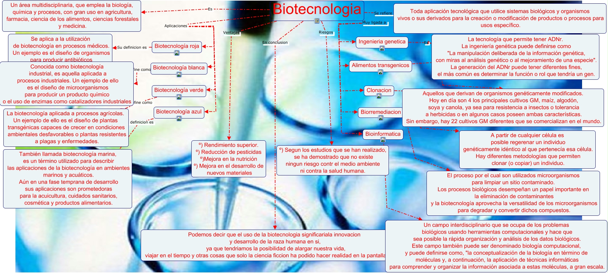 Este Cmap, tiene información relacionada con: Biotecnologia, Biotecnologia En conclusion Podemos decir que el uso de la biotecnologia significariala innovacion y desarrollo de la raza humana en si, ya que tendriamos la posibilidad de alargar nuestra vida, viajar en el tiempo y otras cosas que solo la ciencia ficcion ha podido hacer realidad en la pantalla grande., Biotecnologia Muy ligada a Bioinformatica, Biotecnología roja Su definicion es Se aplica a la utilización de biotecnología en procesos médicos. Un ejemplo es el diseño de organismos para producir antibióticos, Biotecnología verde Se define como La biotecnología aplicada a procesos agrícolas. Un ejemplo de ello es el diseño de plantas transgénicas capaces de crecer en condiciones ambientales desfavorables o plantas resistentes a plagas y enfermedades., Bioinformatica Es Un campo interdisciplinario que se ocupa de los problemas biológicos usando herramientas computacionales y hace que sea posible la rápida organización y análisis de los datos biológicos. Este campo también puede ser denominado biología computacional, y puede definirse como, "la conceptualización de la biología en término de moléculas y, a continuación, la aplicación de técnicas informáticas para comprender y organizar la información asociada a estas moléculas, a gran escala., Alimentos transgenicos Son Aquellos que derivan de organismos genéticamente modificados. Hoy en día son 4 los principales cultivos GM, maíz, algodón, soya y canola, ya sea para resistencia a insectos o tolerancia a herbicidas o en algunos casos poseen ambas características. Sin embargo, hay 22 cultivos GM diferentes que se comercializan en el mundo., Biorremediacion Es El proceso por el cual son utilizados microorganismos para limpiar un sitio contaminado. Los procesos biológicos desempeñan un papel importante en la eliminación de contaminantes y la biotecnología aprovecha la versatilidad de los microorganismos para degradar y convertir dichos compuestos., Biotecnologia Es Un área multidisciplinaria, que emplea la biología, química y procesos, con gran uso en agricultura, farmacia, ciencia de los alimentos, ciencias forestales y medicina., Biotecnologia Muy ligada a Ingenieria genetica, Biotecnologia Muy ligada a Clonacion, Biotecnologia Riesgos º) Segun los estudios que se han realizado, se ha demostrado que no existe ningun riesgo contr el medio ambiente ni contra la salud humana., Biotecnología blanca Se define como Conocida como biotecnología industrial, es aquella aplicada a procesos industriales. Un ejemplo de ello es el diseño de microorganismos para producir un producto químico o el uso de enzimas como catalizadores industriales, Biotecnología azul Su definicion es También llamada biotecnología marina, es un término utilizado para describir las aplicaciones de la biotecnología en ambientes marinos y acuáticos. Aún en una fase temprana de desarrollo sus aplicaciones son prometedoras para la acuicultura, cuidados sanitarios, cosmética y productos alimentarios., Biotecnologia Aplicaciones Biotecnología verde, Biotecnologia Aplicaciones Biotecnología azul, Clonacion Es A partir de cualquier célula es posible regerenar un individuo genéticamente idéntico al que pertenecía esa célula. Hay diferentes metodologías que permiten clonar (o copiar) un individuo., Biotecnologia Aplicaciones Biotecnología roja, Biotecnologia Aplicaciones Biotecnología blanca, Ingenieria genetica Es La tecnología que permite tener ADNr. La ingeniería genética puede definirse como "La manipulación deliberada de la información genética, con miras al análisis genético o al mejoramiento de una especie". La generación del ADNr puede tener diferentes fines, el más común es determinar la función o rol que tendría un gen., Biotecnologia Se refiere a Toda aplicación tecnológica que utilice sistemas biológicos y organismos vivos o sus derivados para la creación o modificación de productos o procesos para usos específico.