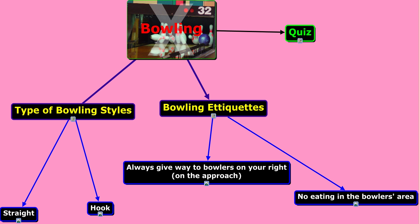 This Concept Map, created with IHMC CmapTools, has information related to: Jeannette, Type of Bowling Styles Straight, Type of Bowling Styles Hook, Bowling Bowling Ettiquettes, Bowling Type of Bowling Styles, Bowling Quiz, Bowling Ettiquettes Always give way to bowlers on your right (on the approach), Bowling Ettiquettes No eating in the bowlers' area