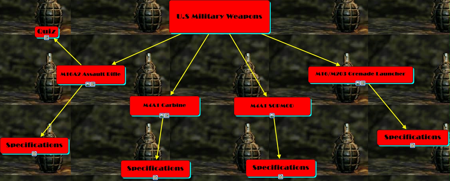 This Concept Map, created with IHMC CmapTools, has information related to: US Military Weapons Final, M16A2 Assault Rifle Quiz, M16/M203 Grenade Launcher Specifications, U.S Military Weapons M16A2 Assault Rifle, U.S Military Weapons M4A1 Carbine, M4A1 SOPMOD Specifications, M16A2 Assault Rifle Specifications, U.S Military Weapons M16/M203 Grenade Launcher, U.S Military Weapons M4A1 SOPMOD, M4A1 Carbine Specifications