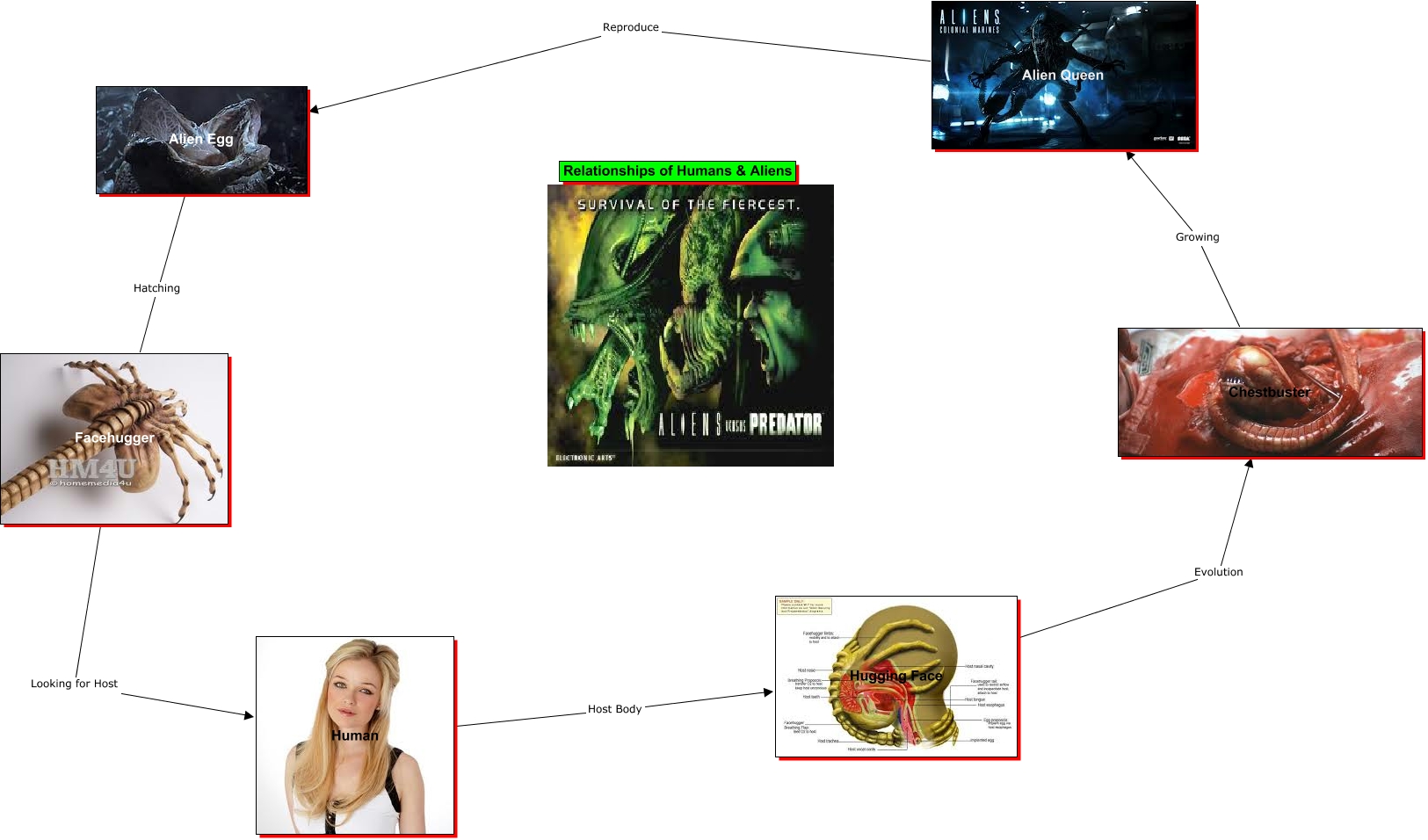 This Concept Map, created with IHMC CmapTools, has information related to: Practice 1, Facehugger Looking for Host Human, Alien Egg Hatching Facehugger, Chestbuster Growing Alien Queen, Alien Queen Reproduce Alien Egg, Hugging Face Evolution Chestbuster, Human Host Body Hugging Face