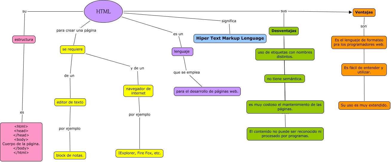 This Concept Map, created with IHMC CmapTools, has information related to: HTML, estructura es <html> <head> </head> <body> Cuerpo de la página. </body> </html>, Desventajas ???? es muy costoso el mantenimiento de las páginas., HTML significa Hiper Text Markup Lenguage, Ventajas son ????, se requiere y de un navegador de internet, editor de texto por ejemplo block de notas., navegador de internet por ejemplo IExplorer, Fire Fox, etc., HTML es un lenguaje, Desventajas ???? El contenido no puede ser reconocido ni procesado por programas., HTML para crear una página se requiere, HTML sus Desventajas, lenguaje que se emplea para el desarrollo de páginas web., HTML sus Ventajas, HTML su estructura, se requiere de un editor de texto
