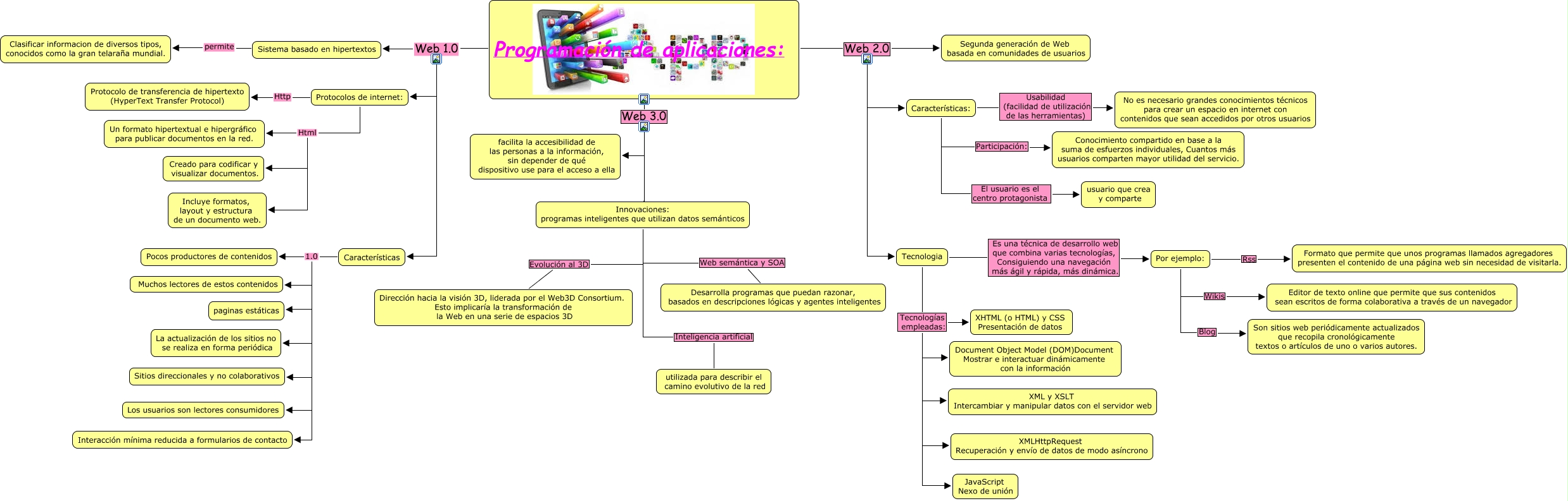 This Concept Map, created with IHMC CmapTools, has information related to: Web, Programación de aplicaciones: Web 2.0 Segunda generación de Web basada en comunidades de usuarios, Tecnologia Tecnologías empleadas: XMLHttpRequest Recuperación y envío de datos de modo asíncrono, Programación de aplicaciones: Web 1.0 Sistema basado en hipertextos, Características 1.0 Muchos lectores de estos contenidos, Innovaciones: programas inteligentes que utilizan datos semánticos Inteligencia artificial utilizada para describir el camino evolutivo de la red, Tecnologia Tecnologías empleadas: Document Object Model (DOM)Document Mostrar e interactuar dinámicamente con la información, Sistema basado en hipertextos permite Clasificar informacion de diversos tipos, conocidos como la gran telaraña mundial., Protocolos de internet: Html Un formato hipertextual e hipergráfico para publicar documentos en la red., Características 1.0 Interacción mínima reducida a formularios de contacto, Características 1.0 Los usuarios son lectores consumidores, Por ejemplo: Blog Son sitios web periódicamente actualizados que recopila cronológicamente textos o artículos de uno o varios autores., Características: Usabilidad (facilidad de utilización de las herramientas) No es necesario grandes conocimientos técnicos para crear un espacio en internet con contenidos que sean accedidos por otros usuarios, Tecnologia Tecnologías empleadas: XHTML (o HTML) y CSS Presentación de datos, Tecnologia Tecnologías empleadas: XML y XSLT Intercambiar y manipular datos con el servidor web, Tecnologia Tecnologías empleadas: JavaScript Nexo de unión, Programación de aplicaciones: Web 3.0 facilita la accesibilidad de las personas a la información, sin depender de qué dispositivo use para el acceso a ella, Características: El usuario es el centro protagonista usuario que crea y comparte, Protocolos de internet: Http Protocolo de transferencia de hipertexto (HyperText Transfer Protocol), Programación de aplicaciones: Web 1.0 Características, Características 1.0 paginas estáticas