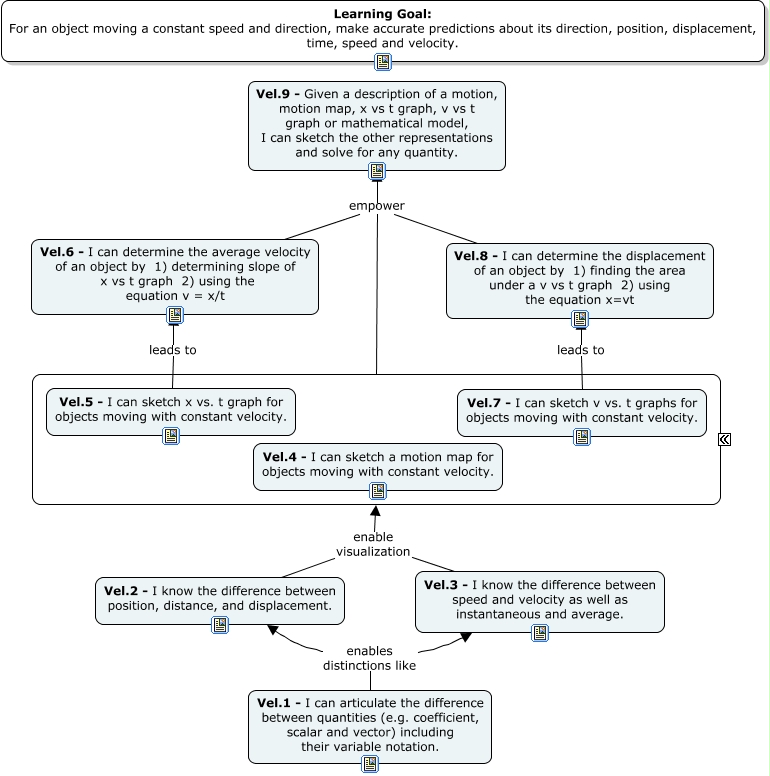 This Concept Map, created with IHMC CmapTools, has information related to: CVPM - Learning Progression, Vel.7 - I can sketch v vs. t graphs for objects moving with constant velocity. leads to Vel.8 - I can determine the displacement of an object by 1) finding the area under a v vs t graph 2) using the equation x=vt, Vel.8 - I can determine the displacement of an object by 1) finding the area under a v vs t graph 2) using the equation x=vt empower Vel.9 - Given a description of a motion, motion map, x vs t graph, v vs t graph or mathematical model, I can sketch the other representations and solve for any quantity., Vel.1 - I can articulate the difference between quantities (e.g. coefficient, scalar and vector) including their variable notation. enables distinctions like Vel.2 - I know the difference between position, distance, and displacement., Vel.1 - I can articulate the difference between quantities (e.g. coefficient, scalar and vector) including their variable notation. enables distinctions like Vel.3 - I know the difference between speed and velocity as well as instantaneous and average., Vel.2 - I know the difference between position, distance, and displacement. enable visualization ????, Vel.6 - I can determine the average velocity of an object by 1) determining slope of x vs t graph 2) using the equation v = x/t empower Vel.9 - Given a description of a motion, motion map, x vs t graph, v vs t graph or mathematical model, I can sketch the other representations and solve for any quantity., Vel.3 - I know the difference between speed and velocity as well as instantaneous and average. enable visualization ????, Vel.5 - I can sketch x vs. t graph for objects moving with constant velocity. leads to Vel.6 - I can determine the average velocity of an object by 1) determining slope of x vs t graph 2) using the equation v = x/t, ???? empower Vel.9 - Given a description of a motion, motion map, x vs t graph, v vs t graph or mathematical model, I can sketch the other representations and solve for any quantity.