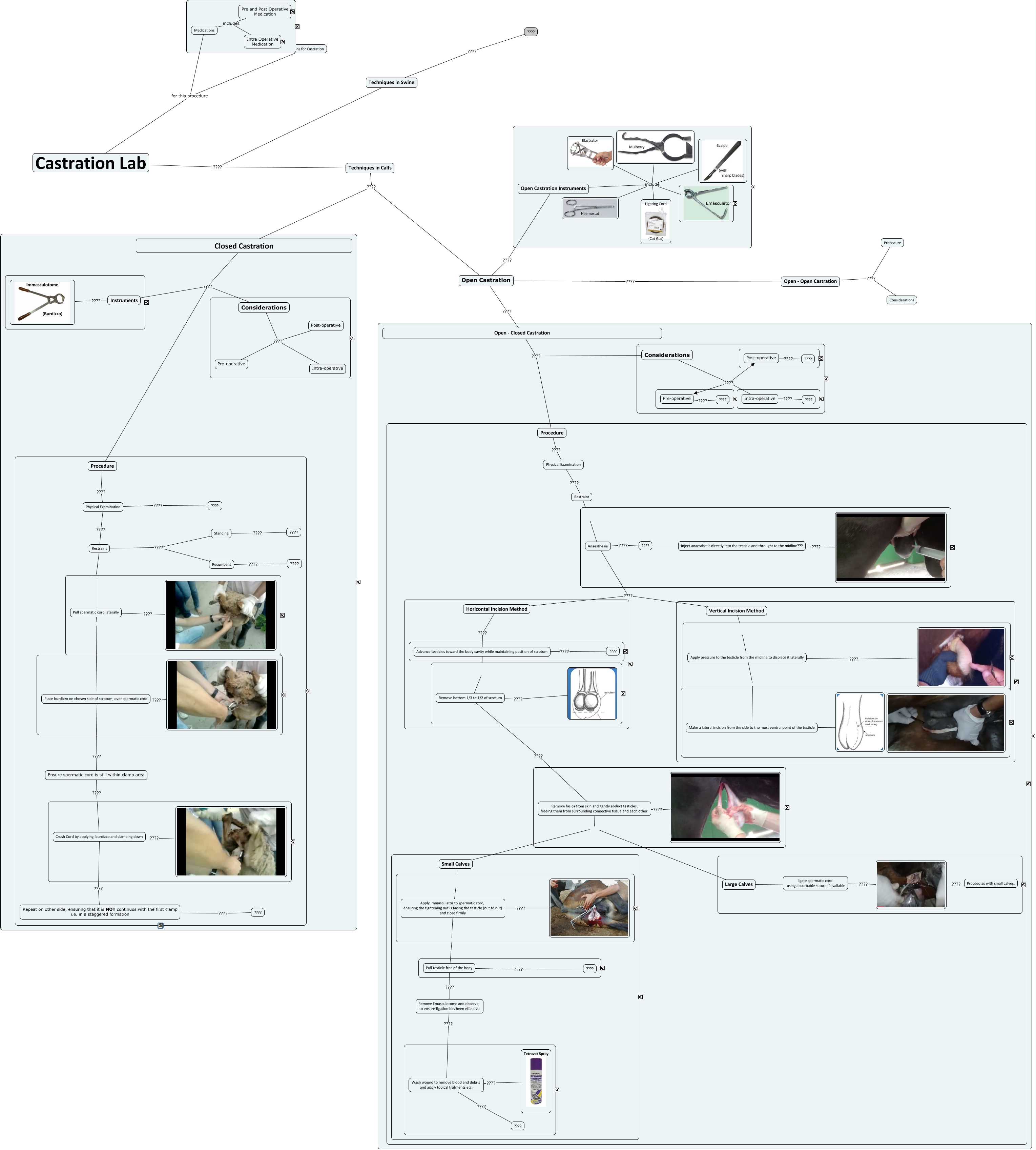 This Concept Map, created with IHMC CmapTools, has information related to: Castration Lab, Horizontal Incision Method ???? Advance testicles toward the body cavity while maintaining position of scrotum, Standing ???? ????, ligate spermatic cord. using absorbable suture if available ????, Castration Lab ???? Techniques in Calfs, Remove bottom 1/3 to 1/2 of scrotum ????, Pull spermatic cord laterally ???? Place burdizzo on chosen side of scrotum, over spermatic cord, Open Castration Instruments include Mulberry, Castration Lab for this procedure Medications, Crush Cord by applying burdizzo and clamping down ???? Repeat on other side, ensuring that it is NOT continuos with the first clamp i.e. in a staggered formation, Techniques in Swine ???? ????, Closed Castration ???? Procedure, Open Castration Instruments include Haemostat, Remove fasica from skin and gently abduct testicles, freeing them from surrounding connective tissue and each other ????, Small Calves ???? Apply Immasculator to spermatic cord, ensuring the tigntening nut is facing the testicle (nut to nut) and close firmly, Restraint ???? Recumbent, Restraint ???? Pull spermatic cord laterally, Anaesthesia ???? Vertical Incision Method, Apply Immasculator to spermatic cord, ensuring the tigntening nut is facing the testicle (nut to nut) and close firmly ???? ????, Remove fasica from skin and gently abduct testicles, freeing them from surrounding connective tissue and each other ???? Large Calves, Restraint ???? Anaesthesia