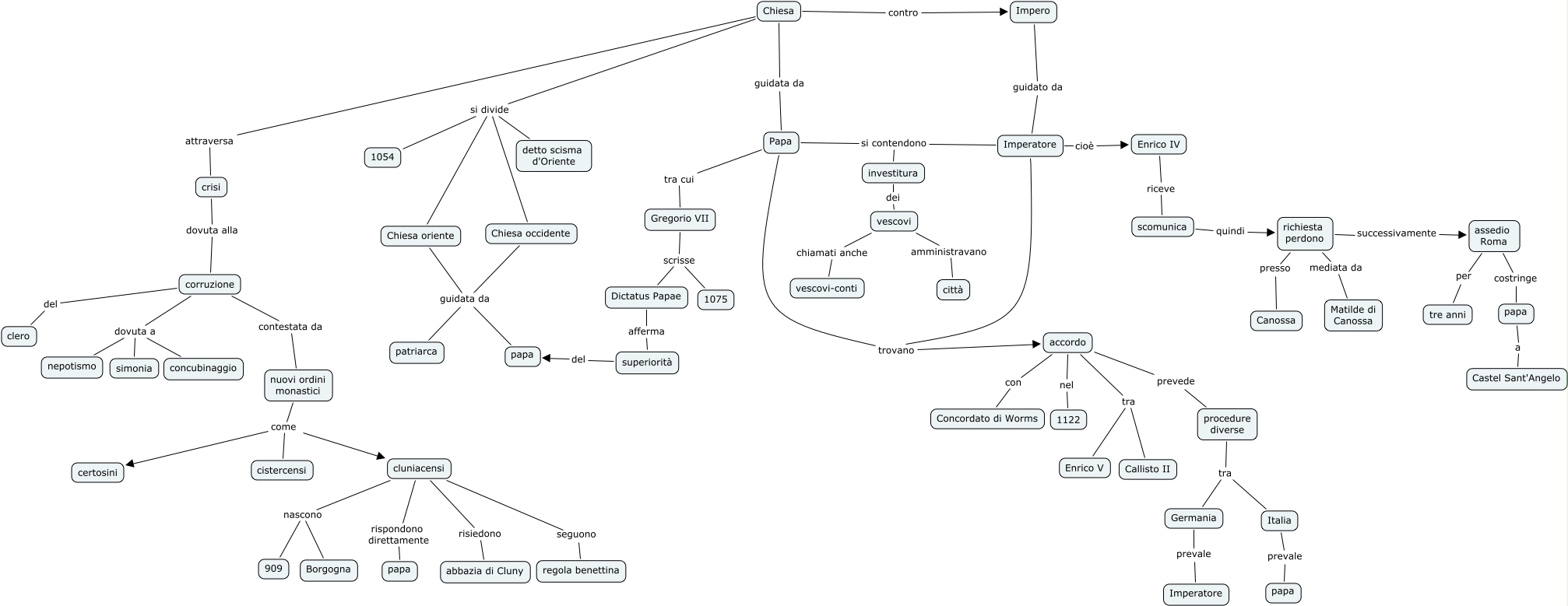 Questa Cmap, creata con IHMC CmapTools, contiene informazioni relative a: lotta_investiture, Italia prevale papa, Chiesa si divide 1054, vescovi amministravano città, corruzione del clero, Imperatore trovano accordo, accordo prevede procedure diverse, superiorità del papa, Chiesa si divide detto scisma d'Oriente, assedio Roma costringe papa, cluniacensi seguono regola benettina, Chiesa si divide Chiesa occidente, Imperatore si contendono investitura, Papa tra cui Gregorio VII, Chiesa guidata da Papa, papa a Castel Sant'Angelo, Enrico IV riceve scomunica, Gregorio VII scrisse 1075, procedure diverse tra Germania, corruzione dovuta a concubinaggio, assedio Roma per tre anni