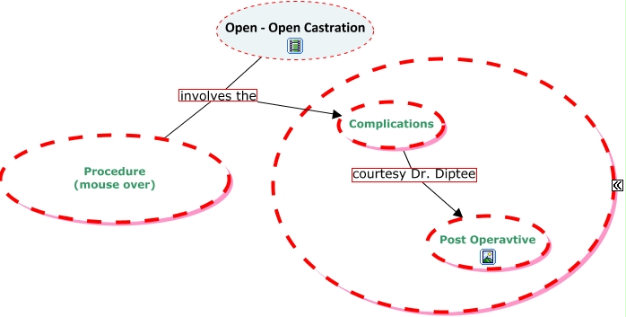 This Concept Map, created with IHMC CmapTools, has information related to: open open, Complications courtesy Dr. Diptee Post Operavtive, Open - Open Castration involves the Procedure (mouse over), Open - Open Castration involves the Complications
