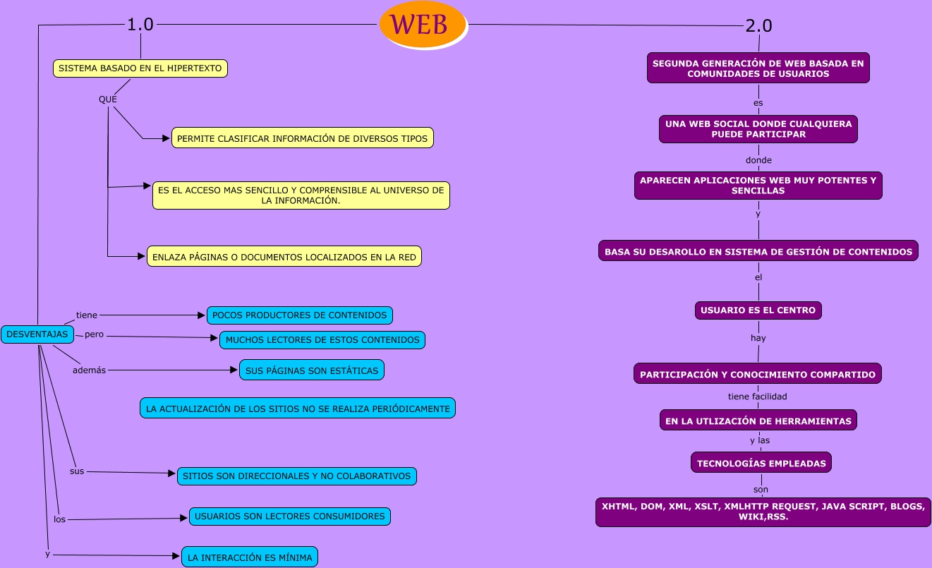 This Concept Map, created with IHMC CmapTools, has information related to: EVOLUCION WEB, DESVENTAJAS pero MUCHOS LECTORES DE ESTOS CONTENIDOS, APARECEN APLICACIONES WEB MUY POTENTES Y SENCILLAS y BASA SU DESAROLLO EN SISTEMA DE GESTIÓN DE CONTENIDOS, DESVENTAJAS además SUS PÁGINAS SON ESTÁTICAS, SISTEMA BASADO EN EL HIPERTEXTO QUE ES EL ACCESO MAS SENCILLO Y COMPRENSIBLE AL UNIVERSO DE LA INFORMACIÓN., TECNOLOGÍAS EMPLEADAS son XHTML, DOM, XML, XSLT, XMLHTTP REQUEST, JAVA SCRIPT, BLOGS, WIKI,RSS., WEB 1.0 SISTEMA BASADO EN EL HIPERTEXTO, WEB 1.0 DESVENTAJAS, SISTEMA BASADO EN EL HIPERTEXTO QUE PERMITE CLASIFICAR INFORMACIÓN DE DIVERSOS TIPOS, UNA WEB SOCIAL DONDE CUALQUIERA PUEDE PARTICIPAR donde APARECEN APLICACIONES WEB MUY POTENTES Y SENCILLAS, SEGUNDA GENERACIÓN DE WEB BASADA EN COMUNIDADES DE USUARIOS es UNA WEB SOCIAL DONDE CUALQUIERA PUEDE PARTICIPAR, USUARIO ES EL CENTRO hay PARTICIPACIÓN Y CONOCIMIENTO COMPARTIDO, WEB 2.0 SEGUNDA GENERACIÓN DE WEB BASADA EN COMUNIDADES DE USUARIOS, BASA SU DESAROLLO EN SISTEMA DE GESTIÓN DE CONTENIDOS el USUARIO ES EL CENTRO, EN LA UTLIZACIÓN DE HERRAMIENTAS y las TECNOLOGÍAS EMPLEADAS, DESVENTAJAS sus SITIOS SON DIRECCIONALES Y NO COLABORATIVOS, SISTEMA BASADO EN EL HIPERTEXTO QUE ENLAZA PÁGINAS O DOCUMENTOS LOCALIZADOS EN LA RED, DESVENTAJAS y LA INTERACCIÓN ES MÍNIMA, DESVENTAJAS los USUARIOS SON LECTORES CONSUMIDORES, PARTICIPACIÓN Y CONOCIMIENTO COMPARTIDO tiene facilidad EN LA UTLIZACIÓN DE HERRAMIENTAS, DESVENTAJAS tiene POCOS PRODUCTORES DE CONTENIDOS