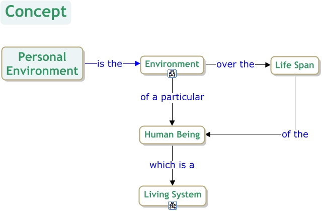 This Concept Map, created with IHMC CmapTools, has information related to: Personal Environment, Life Span of the Human Being, Personal Environment is the Environment, Environment over the Life Span, Environment of a particular Human Being, Human Being which is a Living System