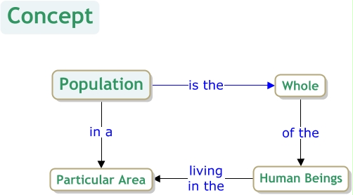 This Concept Map, created with IHMC CmapTools, has information related to: Population, Population in a Particular Area, Population is the Whole, Human Beings living in the Particular Area, Whole of the Human Beings