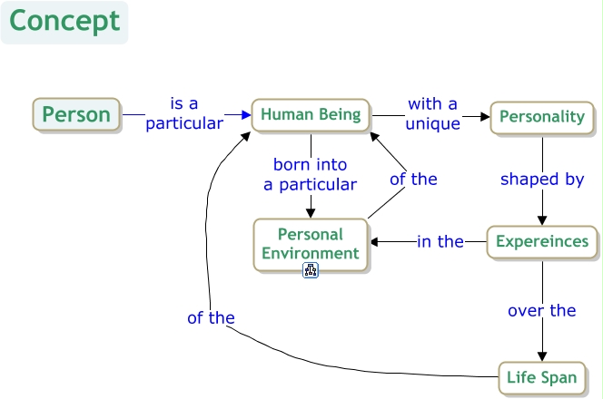 This Concept Map, created with IHMC CmapTools, has information related to: Person, Human Being with a unique Personality, Expereinces over the Life Span, Personality shaped by Expereinces, Person is a particular Human Being, Life Span of the Human Being, Personal Environment of the Human Being, Human Being born into a particular Personal Environment, Expereinces in the Personal Environment