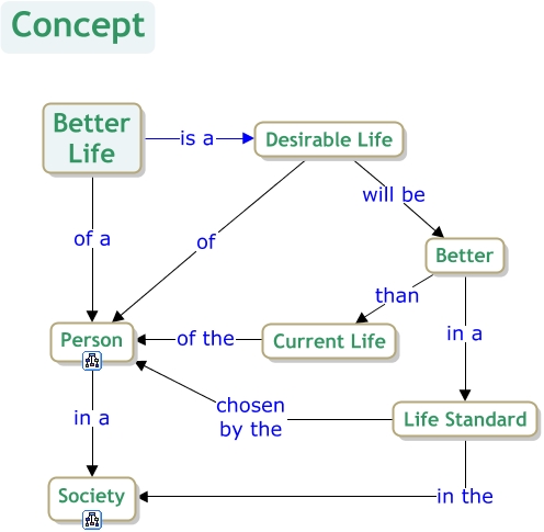 This Concept Map, created with IHMC CmapTools, has information related to: Better Life, Life Standard in the Society, Better than Current Life, Life Standard chosen by the Person, Better Life is a Desirable Life, Desirable Life will be Better, Better in a Life Standard, Desirable Life of Person, Person in a Society, Better Life of a Person, Current Life of the Person
