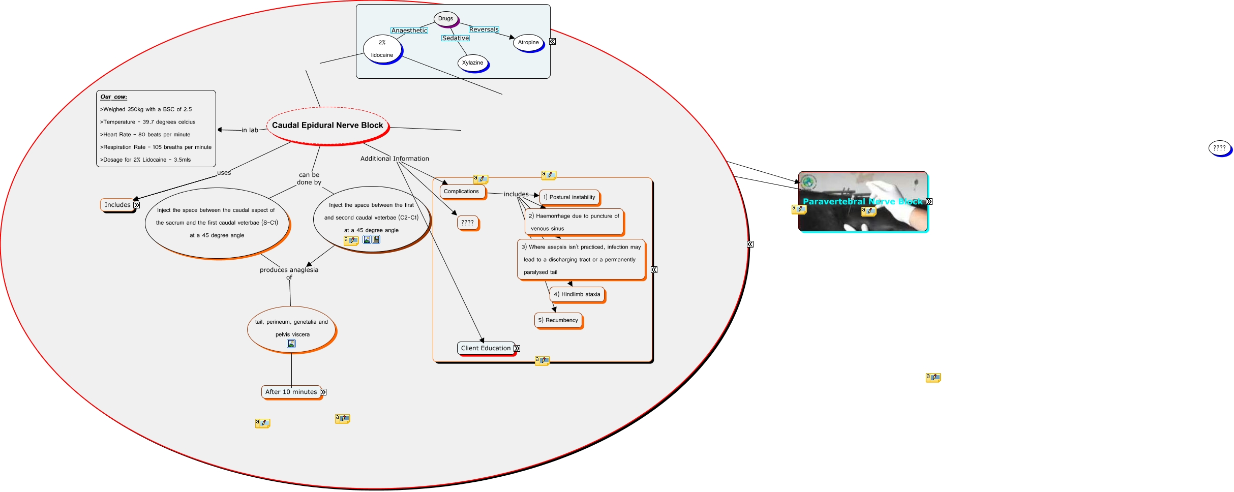 This Concept Map, created with IHMC CmapTools, has information related to: Untitled, In the case of hind limb paralysis in a ewe this requires farmer to temporarily remove lambs, Complications includes 2) Haemorrhage due to puncture of venous sinus, Complications/Problems During Intra Operative, Complications/Problems During Intra Operative, 2% lidocaine 0.2mg/kg Caudal Epidural Nerve Block, Paravertebral Block Used to provide uniform desensitisation of the peritoneum than is field infiltration, and also provides relaxation of the abdominal wall., Caudal Epidural Nerve Block Techniques for correct needle position "No Resistance Technique", Intraoperative ???? Analgesic solution may be injected below fascial sheets and therefore not bathe the nerves., Complications includes 4) Hindlimb ataxia, Caudal Epidural Nerve Block in lab Our cow: >Weighed 350kg with a BSC of 2.5 >Temperature - 39.7 degrees celcius >Heart Rate - 80 beats per minute >Respiration Rate - 105 breaths per minute >Dosage for 2% Lidocaine - 3.5mls, Post Operative dilema with Withdrawal time problems, Caudal Epidural Nerve Block Additional Information In the case of hind limb paralysis in a ewe, Caudal Epidural Nerve Block Techniques for correct needle position "Hanging Drop Technique", Client Inforamtion information about Aftercare, Caudal Epidural Nerve Block Additional Information ????, Successful Block Observe Anaesthesia of the skin, Caudal Epidural Nerve Block uses 4) Embryotomy, Drugs Sedative Xylazine, Complications includes 5) Recumbency, Complications includes 3) Where asepsis isn't practiced, infection may lead to a discharging tract or a permanently paralysed tail