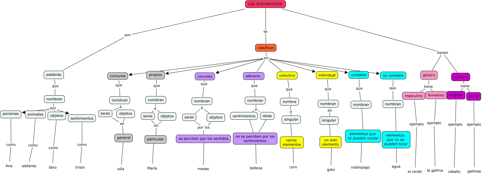 Este Cmap, tiene información relacionada con: sustantivos (María y Derek), nombran a objetos, singular ???? varios elementos, personas como Ana, María ???? particular, abtracto que nombran, LOS SUSTANTIVOS son palabras, contable que nombran, nombran a sentimientos, relámpago ???? elementos que se pueden contar, sentimientos como triste, seres en particular, nombran a seres, colectivo que nombra, LOS SUSTANTIVOS tienen número, silla ???? general, se perciben por los sentidos como mesas, objetos en particular, género tiene femenino, sentimientos ???? no se perciben por los sentimientos, masculino ejemplo el cerdo