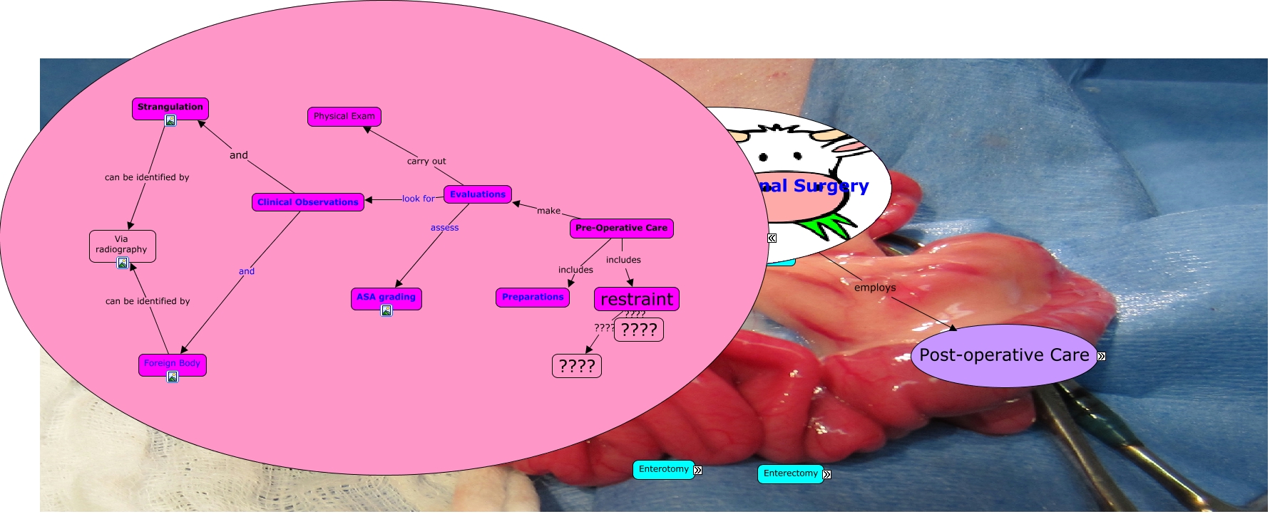 This Concept Map, created with IHMC CmapTools, has information related to: Untitled 2, restraint ???? ????, Post-Operative Care includes Wound Management, Evaluations look for Clinical Observations, Pre-Operative Care includes Preparations, Strangulation can be identified by Via radiography, *Intestinal Resection and anastamosis includes End to end, Evaluations assess ASA grading, Enterectomy involves *Intestinal Resection and anastamosis, Pre-Operative Care make Evaluations, Post-Operative Care has *Complications, Clinical Observations and Strangulation, Evaluations carry out Physical Exam, Post-Operative Care involves observing Recovery, Foreign Body can be identified by Via radiography, Clinical Observations and Foreign Body, Large Animal Intestinal Surgery employs Post-Operative Care, Pre-Operative Care includes restraint, Large Animal Intestinal Surgery entails Pre-operative Care, Post-Operative Care must entail Client Education, *Intestinal Resection and anastamosis includes End to side