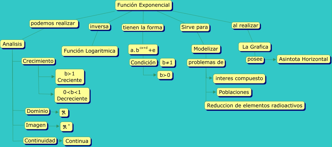 Este Cmap, tiene información relacionada con: funcion exponencial, Analisis Dominio ℜ, Modelizar problemas de Poblaciones, Analisis Crecimiento 0≺b≺1 Decreciente, Analisis Imagen <math xmlns="http://www.w3.org/1998/Math/MathML"> <mrow> <mmultiscripts> <mtext> ℜ </mtext> <none/> <mtext> + </mtext> </mmultiscripts> </mrow> </math>, Modelizar problemas de Reduccion de elementos radioactivos, Analisis Continuidad Continua, Función Exponencial podemos realizar Analisis, <math xmlns="http://www.w3.org/1998/Math/MathML"> <mrow> <mtext> a. </mtext> <mmultiscripts> <mtext> b </mtext> <none/> <mtext> cx+d </mtext> </mmultiscripts> <mtext> +e </mtext> </mrow> </math> Condición b≻0, Analisis Crecimiento b≻1 Creciente, La Grafica posee Asintota Horizontal, Función Exponencial Sirve para Modelizar, Función Exponencial inversa Función Logaritmica, Función Exponencial tienen la forma <math xmlns="http://www.w3.org/1998/Math/MathML"> <mrow> <mtext> a. </mtext> <mmultiscripts> <mtext> b </mtext> <none/> <mtext> cx+d </mtext> </mmultiscripts> <mtext> +e </mtext> </mrow> </math>, <math xmlns="http://www.w3.org/1998/Math/MathML"> <mrow> <mtext> a. </mtext> <mmultiscripts> <mtext> b </mtext> <none/> <mtext> cx+d </mtext> </mmultiscripts> <mtext> +e </mtext> </mrow> </math> Condición b≠1, Modelizar problemas de interes compuesto, Función Exponencial al realizar La Grafica