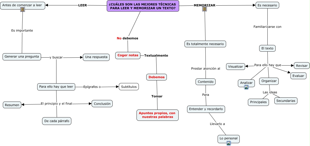 Este Cmap, tiene información relacionada con: READING AND REMEMBERING, Para ello hay que leer El principio y el final De cada párrafo, Contenido Para Entender y recordarlo, Es totalmente necesario Prestar atención al Contenido, Antes de comenzar a leer Es importante Generar una pregunta, El texto Para ello hay que Evaluar, Organizar Las ideas Principales, El texto Para ello hay que Analizar, Para ello hay que leer Epígrafes o Subtítulos, Generar una pregunta y buscar Una respuesta, Para ello hay que leer El principio y el final Resumen, ¿CUÁLES SON LAS MEJORES TÉCNICAS PARA LEER Y MEMORIZAR UN TEXTO? MEMORIZAR Es totalmente necesario, Generar una pregunta y buscar Para ello hay que leer, ¿CUÁLES SON LAS MEJORES TÉCNICAS PARA LEER Y MEMORIZAR UN TEXTO? LEER Antes de comenzar a leer, El texto Para ello hay que Visualizar, Es necesario Familiarizarse con El texto, El texto Para ello hay que Organizar, Para ello hay que leer El principio y el final Conclusión, Organizar Las ideas Secundarias, ¿CUÁLES SON LAS MEJORES TÉCNICAS PARA LEER Y MEMORIZAR UN TEXTO? No debemos Coger notas, Entender y recordarlo Llevarlo a Lo personal