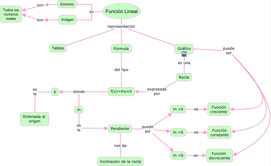 Este Cmap, tiene información relacionada con: funcion lineal, Pendiente puede ser m ɬ, Pendiente nos da Inclinación de la recta, Función Lineal representación Gráfico, f(x)=mx+b donde b, m es la Pendiente, Gráfico es una Recta, m =0 es Función constante, Imágen son Todos los números reales, Recta expresada por f(x)=mx+b, m ɬ es Función creciente, Gráfico puede ser Función constante, Función Lineal su Dominio, m ɘ es Función decreciente, b es la Ordenada al origen, Dominio son Todos los números reales, Gráfico puede ser Función decreciente, f(x)=mx+b donde m, Función Lineal representación Tablas, Gráfico puede ser Función creciente, Función Lineal su Imágen