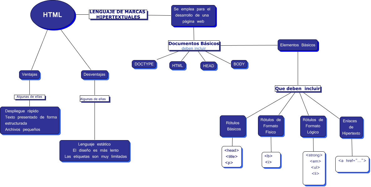 Este Cmap, tiene información relacionada con: -html, Elementos Básicos Que deben incluir Rótulos Básicos, Desventajas ???? HTML, Se emplea para el desarrollo de una página web Documentos Básicos deben incluir HEAD, Ventajas Algunas de ellas Despliegue rápido Texto presentado de forma estructurada Archivos pequeños, Rótulos Básicos ???? <head> <title> <p>, Desventajas Algunas de ellas Lenguaje estático El diseño es más lento Las etiquetas son muy limitadas, Se emplea para el desarrollo de una página web Documentos Básicos deben incluir BODY, HTML LENGUAJE DE MARCAS HIPERTEXTUALES Se emplea para el desarrollo de una página web, Ventajas ???? HTML, Rótulos de Formato Físico ???? <b> <i>, Se emplea para el desarrollo de una página web Documentos Básicos deben incluir Elementos Básicos, Elementos Básicos Que deben incluir Rótulos de Formato Lógico, Rótulos de Formato Lógico ???? <strong> <em> <ul> <li>, Enlaces de Hipertexto ???? <a href="…">, Elementos Básicos Que deben incluir Rótulos de Formato Físico, Se emplea para el desarrollo de una página web Documentos Básicos deben incluir DOCTYPE, Se emplea para el desarrollo de una página web Documentos Básicos deben incluir HTML, Elementos Básicos Que deben incluir Enlaces de Hipertexto, Desventajas ???? HTML