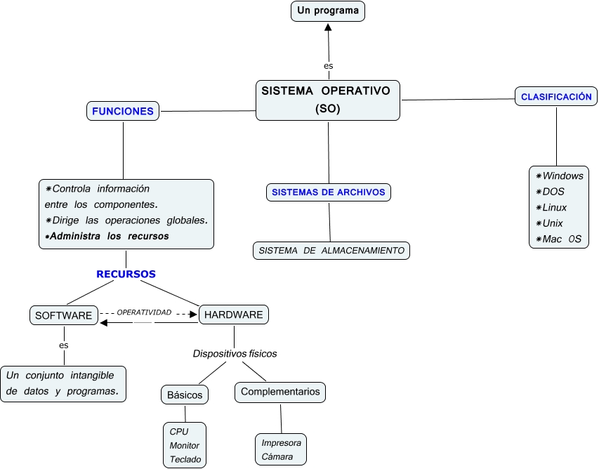 This Concept Map, created with IHMC CmapTools, has information related to: Untitled 3, SISTEMA OPERATIVO (SO) es Un programa, *Controla información entre los componentes. *Dirige las operaciones globales. *Administra los recursos RECURSOS SOFTWARE, HARDWARE Dispositivos físicos Complementarios, *Controla información entre los componentes. *Dirige las operaciones globales. *Administra los recursos RECURSOS HARDWARE, SISTEMA OPERATIVO (SO) ???? SISTEMAS DE ARCHIVOS, SOFTWARE OPERATIVIDAD HARDWARE, Básicos ???? CPU Monitor Teclado, SOFTWARE es Un conjunto intangible de datos y programas., CLASIFICACIÓN ???? *Windows *DOS *Linux *Unix *Mac 0S, SISTEMA OPERATIVO (SO) ???? CLASIFICACIÓN, HARDWARE ----- SOFTWARE, FUNCIONES ???? *Controla información entre los componentes. *Dirige las operaciones globales. *Administra los recursos, SISTEMAS DE ARCHIVOS ???? SISTEMA DE ALMACENAMIENTO, FUNCIONES ???? ????, HARDWARE Dispositivos físicos Básicos, Complementarios ???? Impresora Cámara