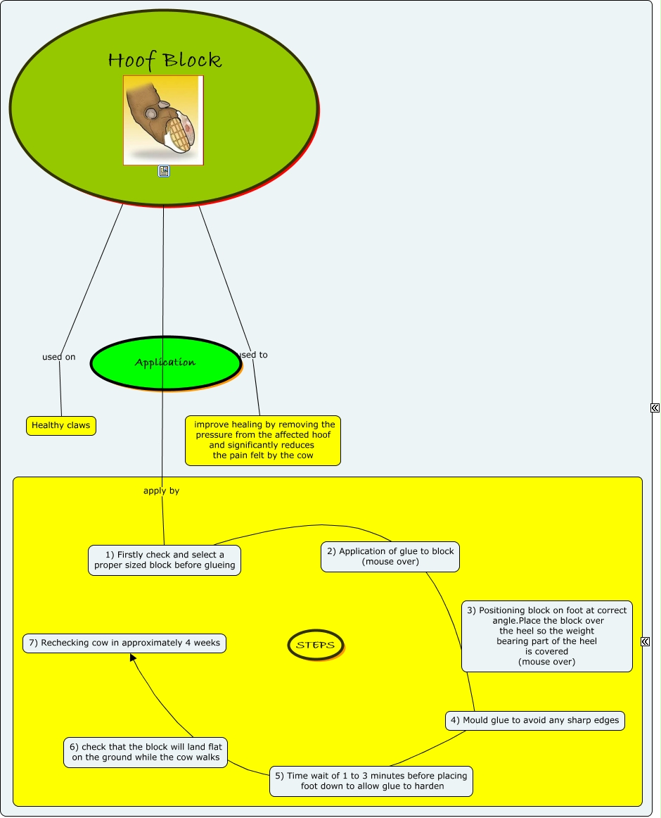 This Concept Map, created with IHMC CmapTools, has information related to: Hoof Block, Hoof Block used to improve healing by removing the pressure from the affected hoof and significantly reduces the pain felt by the cow, Hoof Block used on Healthy claws, 1) Firstly check and select a proper sized block before glueing 7) Rechecking cow in approximately 4 weeks, Hoof Block apply by 1) Firstly check and select a proper sized block before glueing