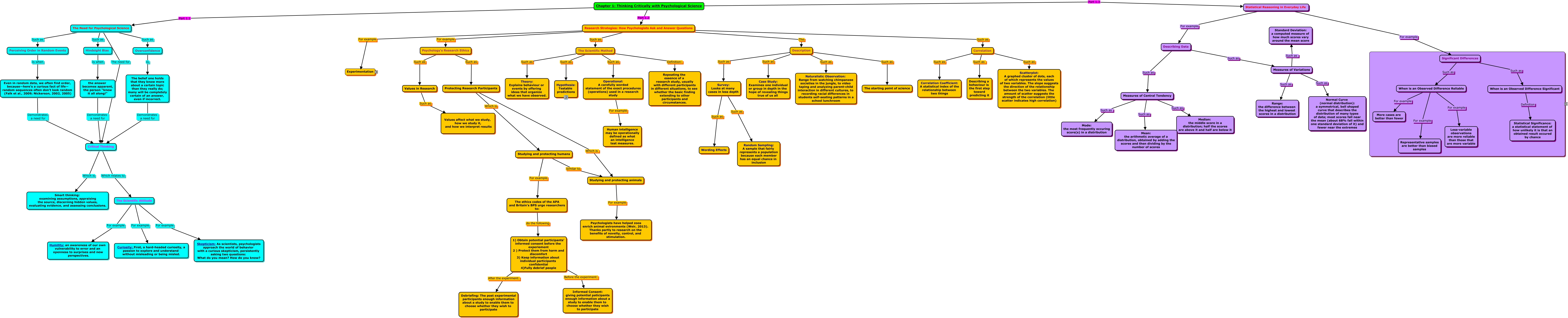 This Concept Map, created with IHMC CmapTools, has information related to: Psych 106 Team Heart (Chapter 1), The belief one holds that they know more about a certain topic than they really do; many will be completely certain of an answer, even if incorrect. Demonstrates a need for Critical Thinking, The Need for Psychological Science Such as Hindsight Bias, Chapter 1: Thinking Critically with Psychological Science Part 1.3 Statistical Reasoning in Everyday Life, A research method in which an investigator manipulates one or more factors (independent variables) to observe the effect on some behaviour or mental process (dependent variable) Such as Random Assignment: Assigning participants to experimental and control groups by chance, thus minimizing pre-existing differences between the different groups., Description Such as Naturalistic Observation: Range from watching chimpanzee societies in the jungle, to video taping and analyzing parent-child interaction in different cultures, to recording racial differences in students self-seating patterns in a school lunchroom, Critical Thinking Which relates to The Scientific Attitude, Measures of Central Tendency Such as Mean: the arithmetic average of a distribution, obtained by adding the scores and then dividing by the number of scores, The ethics codes of the APA and Britain's BPS urge researchers to: do the following 1) Obtain potential participants' informed consent before the experiement 2 ) Protect them from harm and discomfort 3) Keep information about individual participants confidential 4)Fully debrief people, When is an Observed Difference Reliable For example More cases are better than fewer, Significant Differences Such as When is an Observed Difference Significant, The Scientific Method Such as Operational: A carefully worded statement of the exact procedures (operations) used in a research study, Measures of Variations Such as Standard Deviation: a computed measure of how much scores vary around the mean score, Description Such as Case Study: Examines one individual or group in depth in the hope of revealing things true of us all, A research method in which an investigator manipulates one or more factors (independent variables) to observe the effect on some behaviour or mental process (dependent variable) Such as Control Group: The group not exposed to the treatment., The Need for Psychological Science The need for Critical Thinking, Studying and protecting humans For example The ethics codes of the APA and Britain's BPS urge researchers to:, 1) Obtain potential participants' informed consent before the experiement 2 ) Protect them from harm and discomfort 3) Keep information about individual participants confidential 4)Fully debrief people After the experiment: Debriefing: The post experimental participants enough information about a study to enable them to choose whether they wish to participate, Values in Research Such as Values affect what we study, how we study it, and how we interpret results, Operational: A carefully worded statement of the exact procedures (operations) used in a research study For example Human intelligence may be operationally defined as what an intelligence test measures., Independant & Dependant Variables For example Depending Variables: In an experiment, the outcome that is measured; the variable that may change when the independant variable is manipulated.