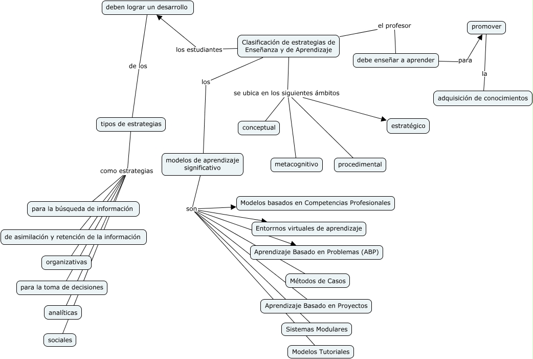 Este Cmap, tiene información relacionada con: clasificación de estrategias de enseñanza y de aprendizaje, deben lograr un desarrollo de los tipos de estrategias, tipos de estrategias como estrategias organizativas, Clasificación de estrategias de Enseñanza y de Aprendizaje se ubica en los siguientes ámbitos conceptual, tipos de estrategias como estrategias analíticas, Clasificación de estrategias de Enseñanza y de Aprendizaje los estudiantes deben lograr un desarrollo, tipos de estrategias como estrategias sociales, modelos de aprendizaje significativo son Aprendizaje Basado en Problemas (ABP), Clasificación de estrategias de Enseñanza y de Aprendizaje se ubica en los siguientes ámbitos estratégico, modelos de aprendizaje significativo son Modelos basados en Competencias Profesionales, Clasificación de estrategias de Enseñanza y de Aprendizaje los modelos de aprendizaje significativo, Clasificación de estrategias de Enseñanza y de Aprendizaje se ubica en los siguientes ámbitos metacognitivo, debe enseñar a aprender para promover, tipos de estrategias como estrategias de asimilación y retención de la información, modelos de aprendizaje significativo son Aprendizaje Basado en Proyectos, tipos de estrategias como estrategias para la búsqueda de información, promover la adquisición de conocimientos, modelos de aprendizaje significativo son Sistemas Modulares, Clasificación de estrategias de Enseñanza y de Aprendizaje el profesor debe enseñar a aprender, modelos de aprendizaje significativo son Entorrnos virtuales de aprendizaje, modelos de aprendizaje significativo son Modelos Tutoriales